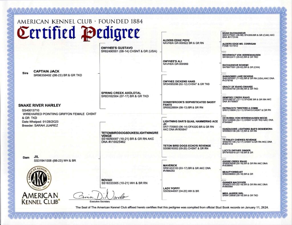 Snake River Harley Posted on March 4, 2018 by Grant Click on Pedigree for an enlarge Picture. Wirehaired Pointing Griffon “Snake River Harley” Pedigree