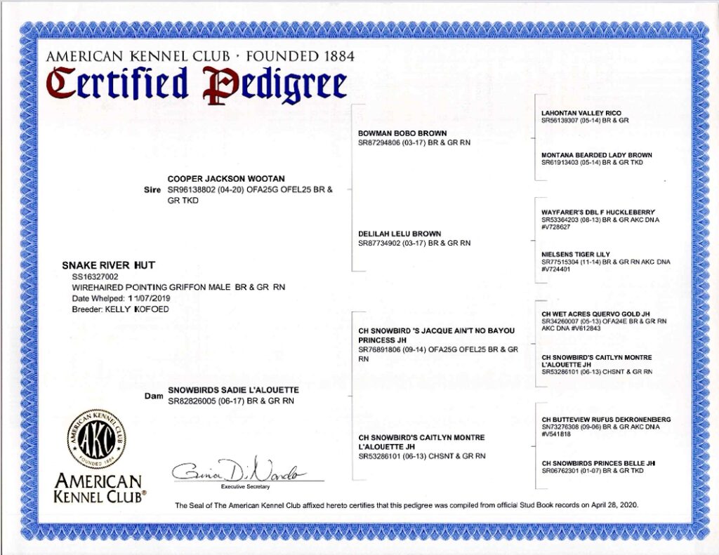 Wirehaired Pointing Griffon “Snake River Hut” Pedigree